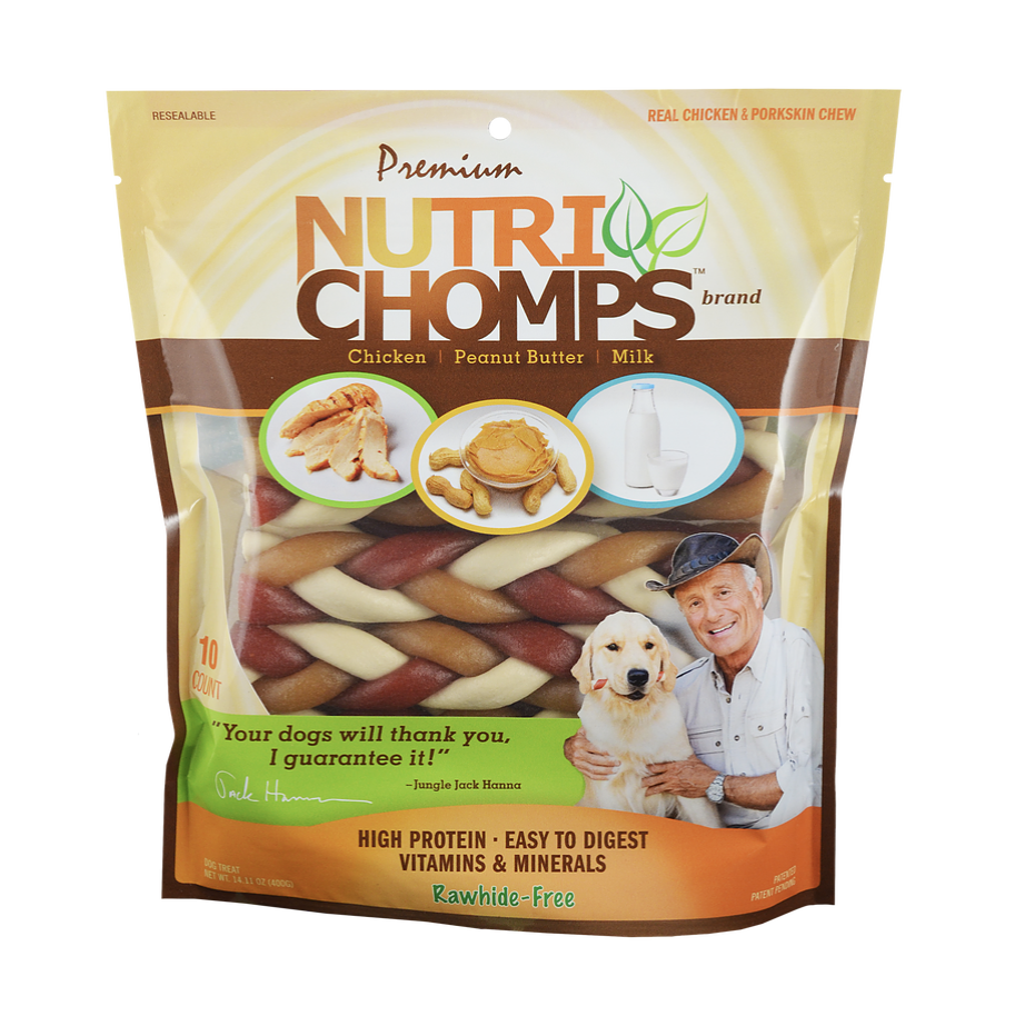 Nutri Chomps are a rawhide-free dog chew. Nutri Chomps are high in fiber & protein and low in carbs. Nutri Chomps first ingredients are chicken and pork skin making them fully digestible. Nutri Chomps are a safe & healthy rawhide alternative. These braids come in an assorted flavor package: Milk, Chicken, and Peanut Butter. The 6" braides are the a perfect chew for small, medium dogs, and some large dogs. If your dog is small, untwist the braids and give out in portions.