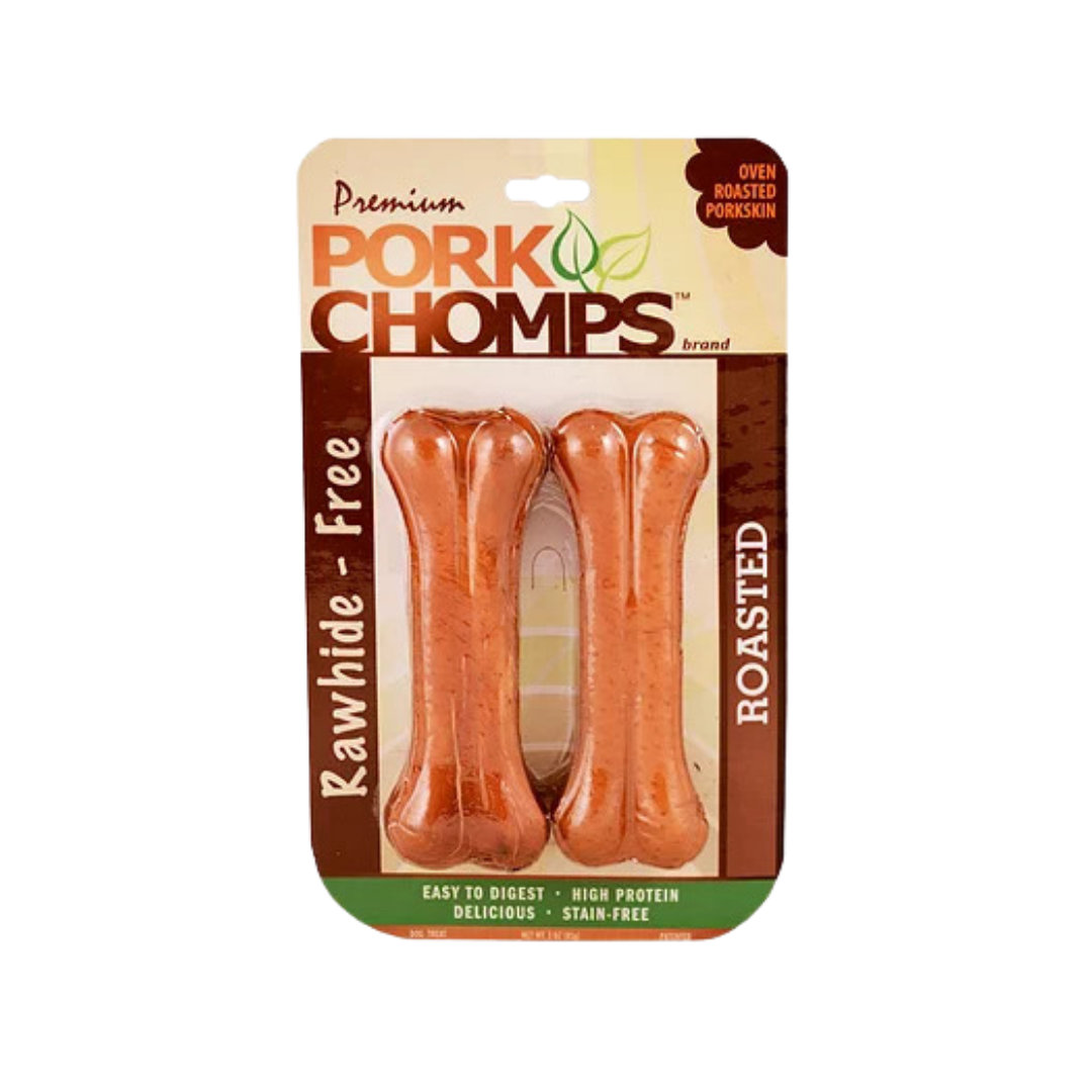Pork Chomps Roasted pork-flavored dog chew. These dog bones are rawhide-free and won’t stain carpet. 2 ct.